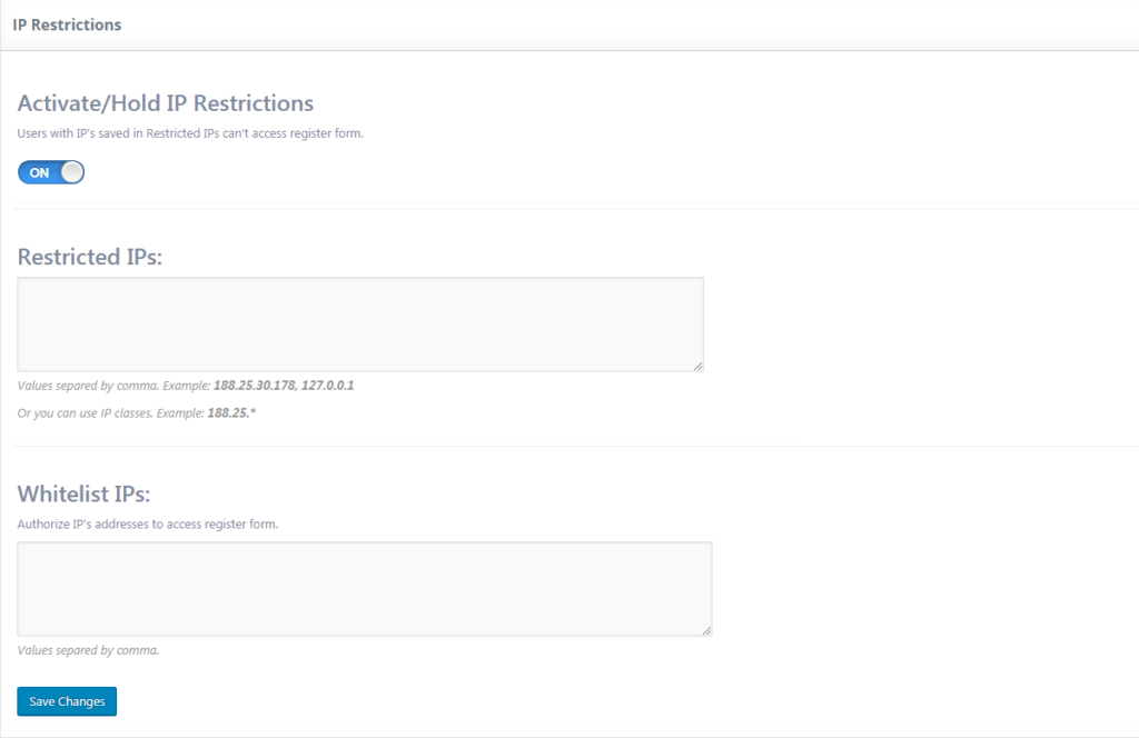 In order to grant users access to the registration form, their IP address can be added to the ’Whitelist IPs’.