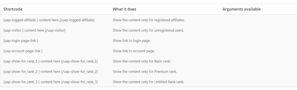 2. A list with shortcodes is available in order to extend the functionality of the affiliate system. Note that the list is not complete. Future shortcodes will be added.