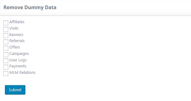 Remove Dummy Data is a module that helps you clean your Ultimate Affiliate Pro plugin of information like affiliates, referrals, payments, and not only. It should be used only in testing mode because every action of removing data is irreversible.