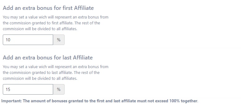 If you set a bonus of 15% for the first affiliate and 20% for the last affiliate, the rest of the 65% from the commission will be split among all affiliates.