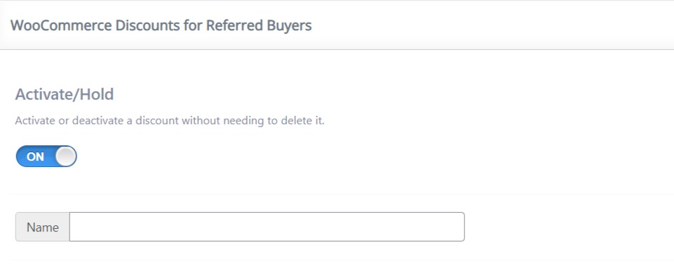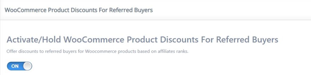 1. WooCommerce Product Discounts For Referred Buyers module can be enabled or disabled by pressing the “Activate/Hold” switcher button from the module panel.