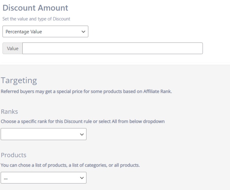 - In the Discount Amount area, you may choose how the discount value will be applied. It can be “Percentage Value” or “Flat Value”.