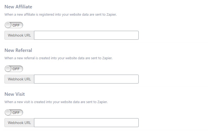For every trigger like ‘New Affiliate’, ‘New Referral’, ‘New Visit’ you may set the webhook URL in Zapier and put it in ‘Webhook URL’ in order to be used by another app.